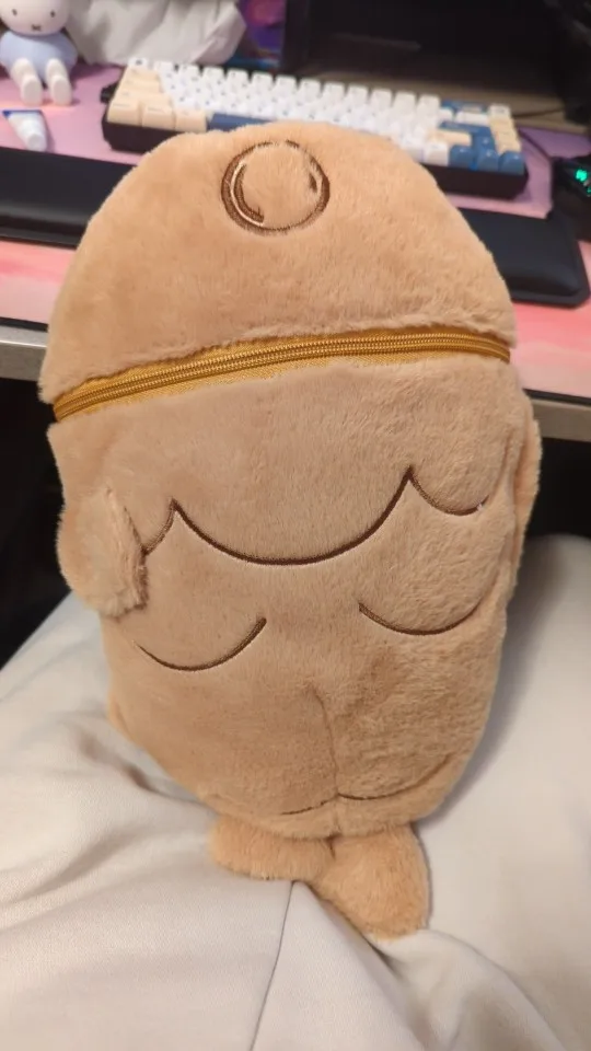 Made from high-quality, soft, and huggable materials, ensuring a comfortable and cozy feel when cuddled. It features a cat-shaped body with the distinct appearance of a taiyaki pastry. It has embroidered eyes, nose, and mouth, along with cute whisker details, adding to its charm.